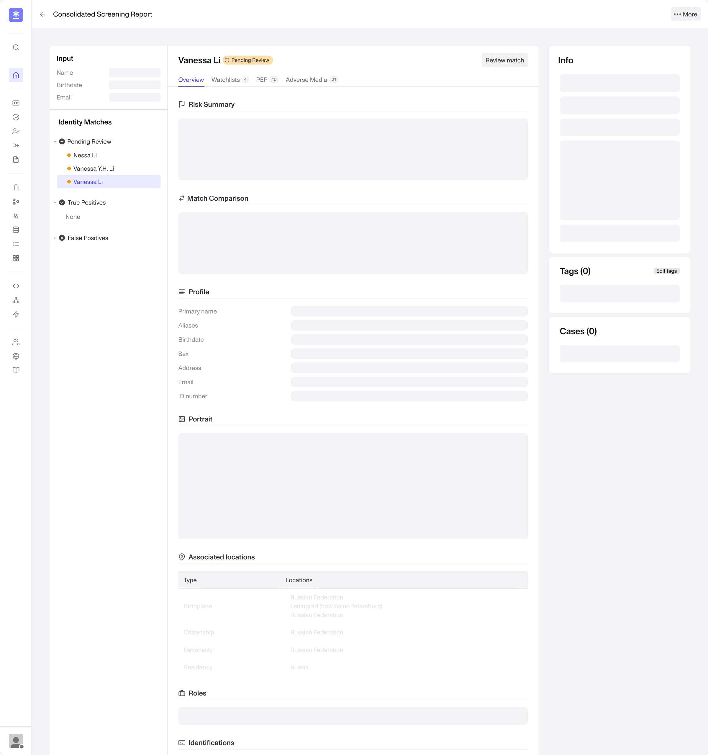 I designed Persona's Consolidated Screening Report experience, a new product that unified five separate compliance reports into one scalable, centralized experience. Working closely with engineers, data and compliance experts, and compliance-focused customers, I mapped real-world review mental models to inform the information architecture — sequencing risk data around the questions users actually ask: Is this a true match? How much due diligence is needed? How severe is the risk? I drove alignment across cross-functional teams from scoping through MVP launch, while designing a framework for the product to scale in the future.